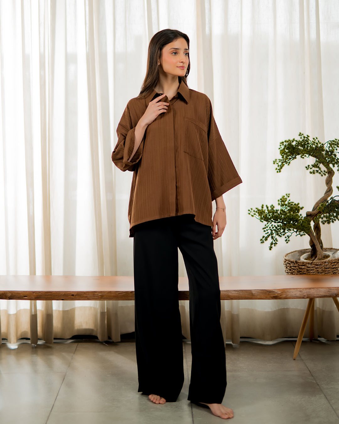 Crafted in a rich cocoa brown shade, this shirt features an oversized silhouette with a huge drop shoulder design for a relaxed and effortless look. The wide sleeves, pointed collar, and concealed button placket add a touch of sophistication, while the soft textured fabric makes it perfect for all-day comfort. A versatile piece that pairs seamlessly with both casual and chic bottoms.